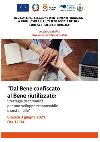 Il Comune di Manfredonia, in merito all'Avviso regionale per la presentazione di proposte progettuali nell'ambito della selezione degli interventi finalizzati a promuovere il riutilizzo sociale dei beni confiscati alla criminalità , indice un incontro pubblico telematico attraverso la piattaforma Zoom di seguito indicata per un confronto ai fini della definizione della progettualità da presentare dal Comune di Manfredonia per la prosecuzione delle iniziative riguardanti il bene confiscato alla Mafia sito in località Siponto e già in utilizzo nell'ambito delle iniziative di antimafia sociale.