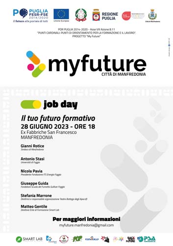"Il tuo futuro formativo". E' il focus del primo Job Day organizzato nel contesto di "My Future", progetto del Comune di Manfredonia vincitore del bando "Punti Cardinali", l'iniziativa della regione Puglia per il potenziamento dell'orientamento formativo e lavorativo, già ben avviato da più di un mese con le attività quotidiana di "Orientation Desk".