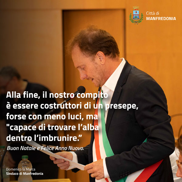 Queste righe di auguri siano anche uno sprone per noi amministratori: a lavorare con sempre più amore per Manfredonia, perché la nostra città merita il meglio dalla Politica, intesa come impegno autentico per il bene comune.
