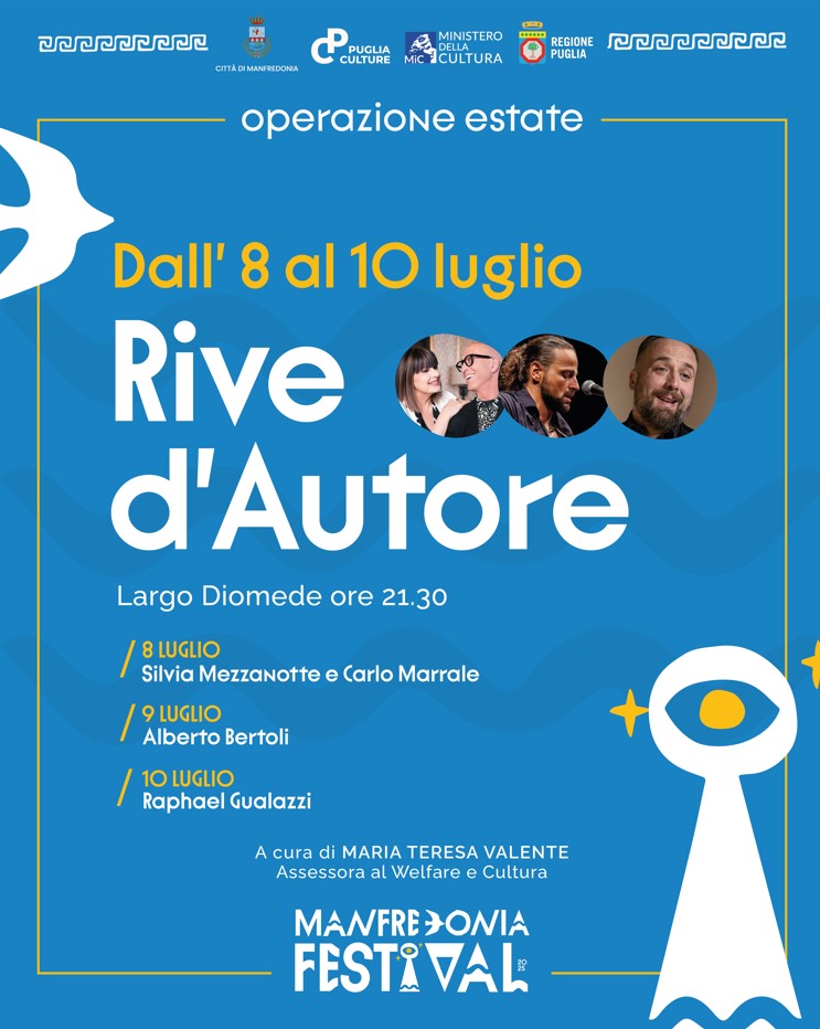Tre serate, tre artisti, una piazza che si affaccia sul Golfo. Nasce a Manfredonia la prima edizione di Rive d’Autore, la rassegna ideata e promossa dall’Assessora al Welfare e Cultura Maria Teresa Valente, che intreccia musica d’autore, racconto e incontri autentici, nel cuore del centro cittadino: Largo Diomede.