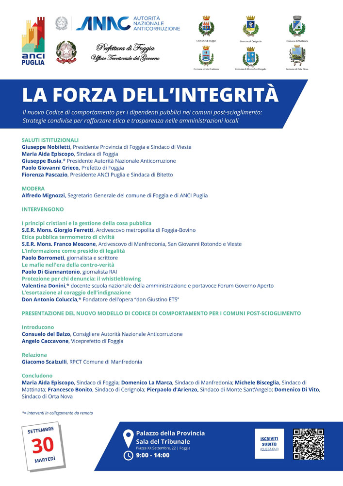 Martedì 30 settembre, dalle ore 9.00 alle ore 14.00 presso la Sala del Tribunale del Palazzo della Provincia (Foggia, Piazza XX Settembre, 22) si terrà un evento formativo dal titolo “La forza dell’integrità”.