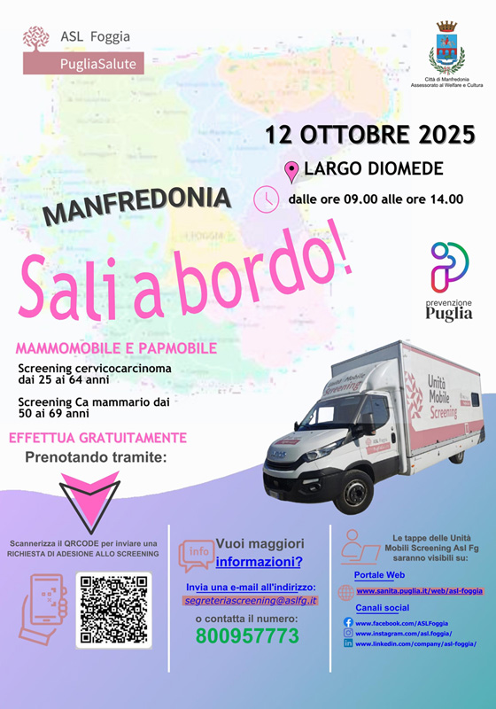 Ottobre è il Mese Internazionale della Prevenzione del Tumore al Seno e Manfredonia sceglie di viverlo con una giornata interamente dedicata alla salute. Domenica 12 ottobre, dalle ore 9.00 alle ore 14.00, Largo Diomede ospiterà il Mammomobile e il Papmobile della ASL Foggia, grazie a un’iniziativa promossa dall’Amministrazione comunale in collaborazione con la stessa ASL.
