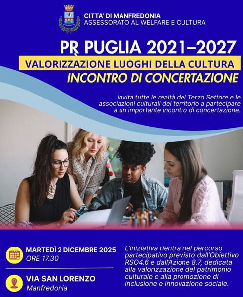 L’Assessorato al Welfare e Cultura della Città di Manfredonia convoca le realtà culturali, associative e sociali del territorio a un incontro di concertazione dedicato alla valorizzazione dei luoghi culturali cittadini e al potenziamento della partecipazione attiva. L’appuntamento è fissato per martedì 2 dicembre 2025 alle ore 17.30 presso la sede dei Servizi Sociali di via San Lorenzo 47.