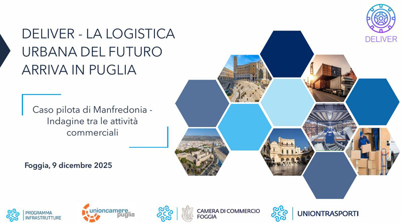 Si è tenuto ieri, presso la Sala Consiglio della Camera di Commercio di Foggia, l’importante momento di riflessione e confronto sul tema della logistica urbana sostenibile, intitolato “DELIVER – LA LOGISTICA URBANA DEL FUTURO ARRIVA IN PUGLIA”. L’incontro è stato promosso dall’Ente camerale in collaborazione con Unioncamere Puglia, il Comune di Manfredonia e Uniontrasporti.
