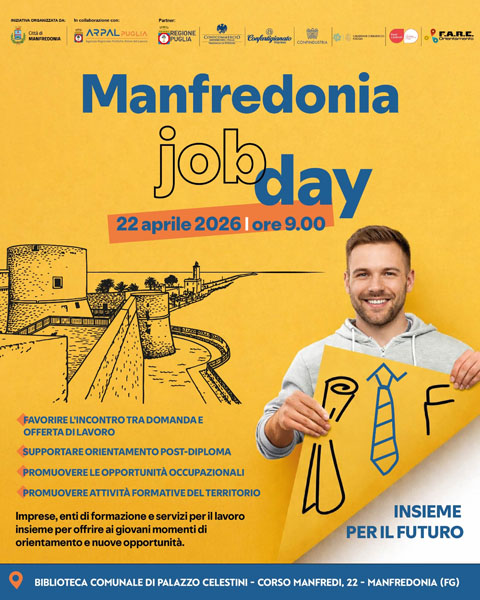 Il Comune di Manfredonia, in collaborazione con ARPAL Puglia, promuove la seconda edizione del Job Day, in programma il 22 aprile presso il Palazzo dei Celestini. L’iniziativa è stata approvata dall’amministrazione comunale nell’ambito delle attività rivolte a favorire il mercato del lavoro e a rafforzare il collegamento tra domanda e offerta sul territorio.